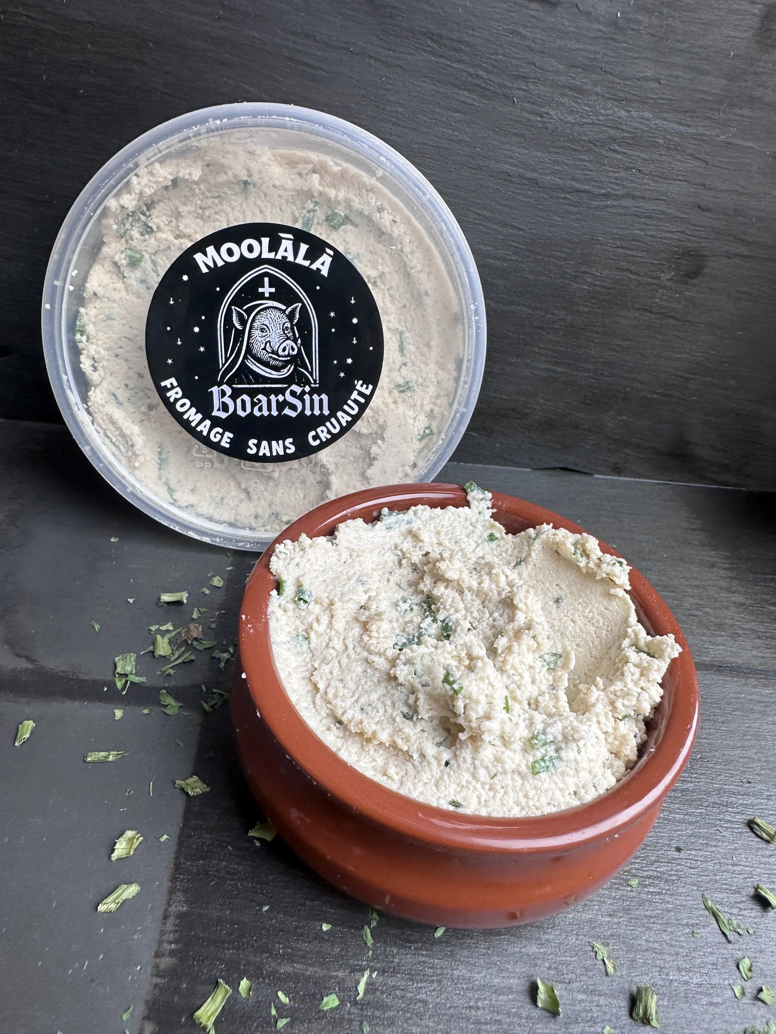 Boarsin is a herbed vegan ch**se alternative inspired by classic garlic-and-herb flavour profiles.